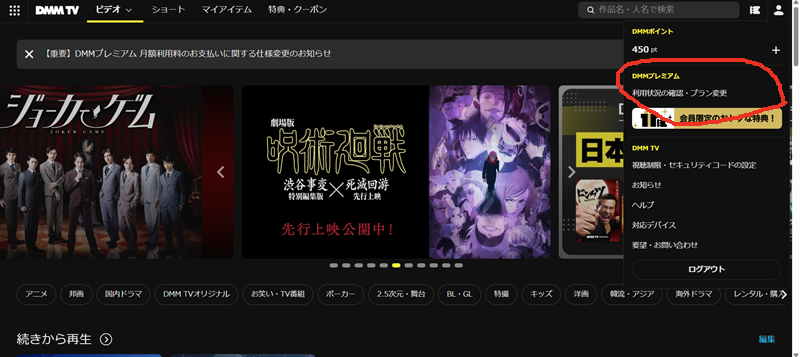 DMM TV公式サイトにアクセスし、右上の「人型マーク」→「利用状況の確認・プラン変更」をタップ