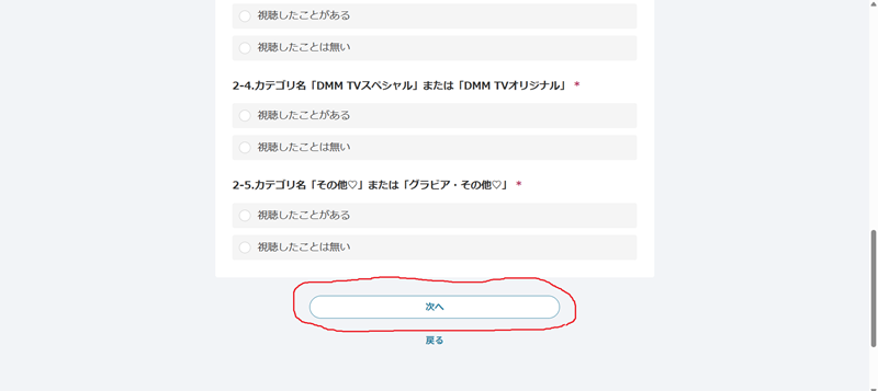 2ページ目も同様に回答し下の方にある「アンケートを送信して次へ」ボタンをタップします。